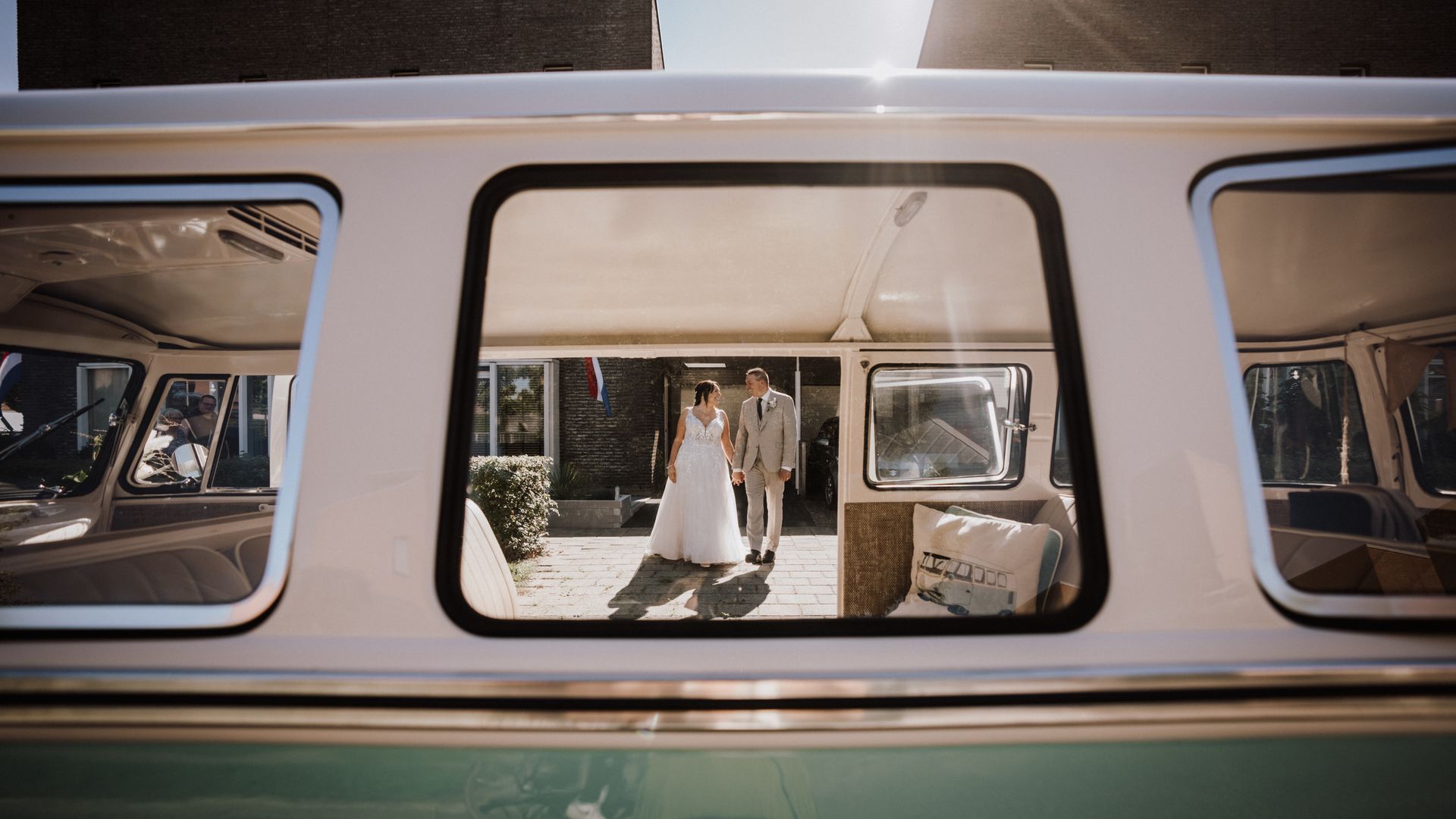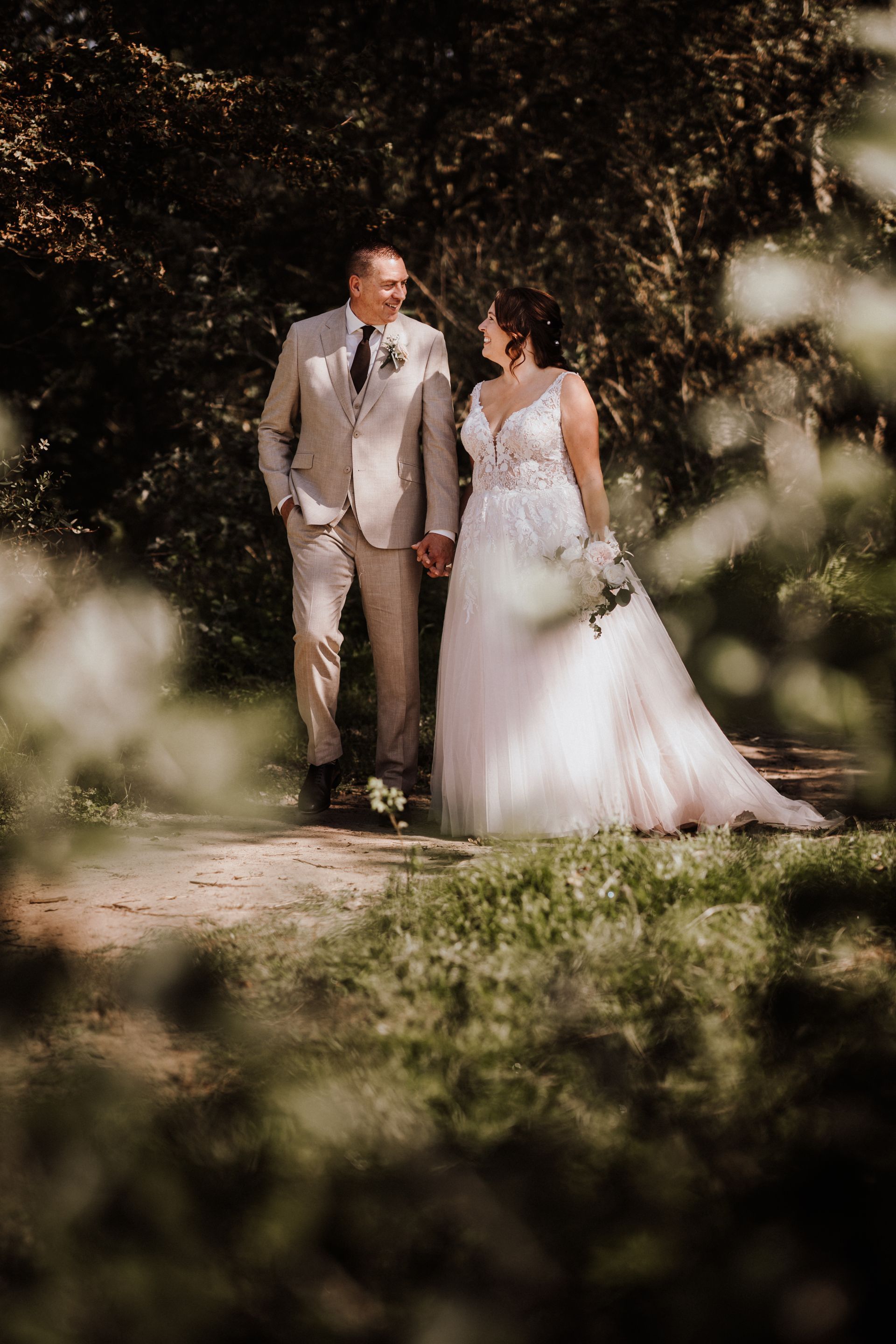 De firstlook werd gehouden in de tuin van hun eigen huis. Daar stond de bruidegom tussen zijn familie en vrienden met enige ongeduld te wachten tot hij zich eindelijk om mocht draaien. Luid geklap, ohhhh's en ahhh's. Wat een mooi stel en wat een liefde. Eerst even een momentje van dorstlessen en een broodje om vervolgens op pad te gaan voor de fotoshoot.