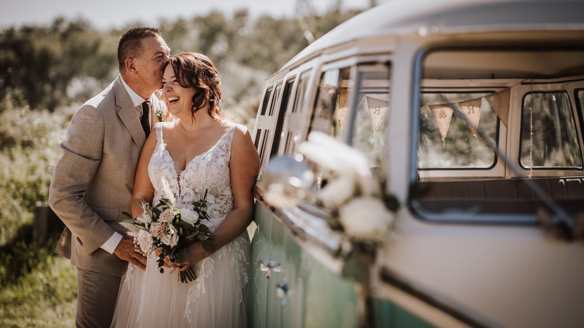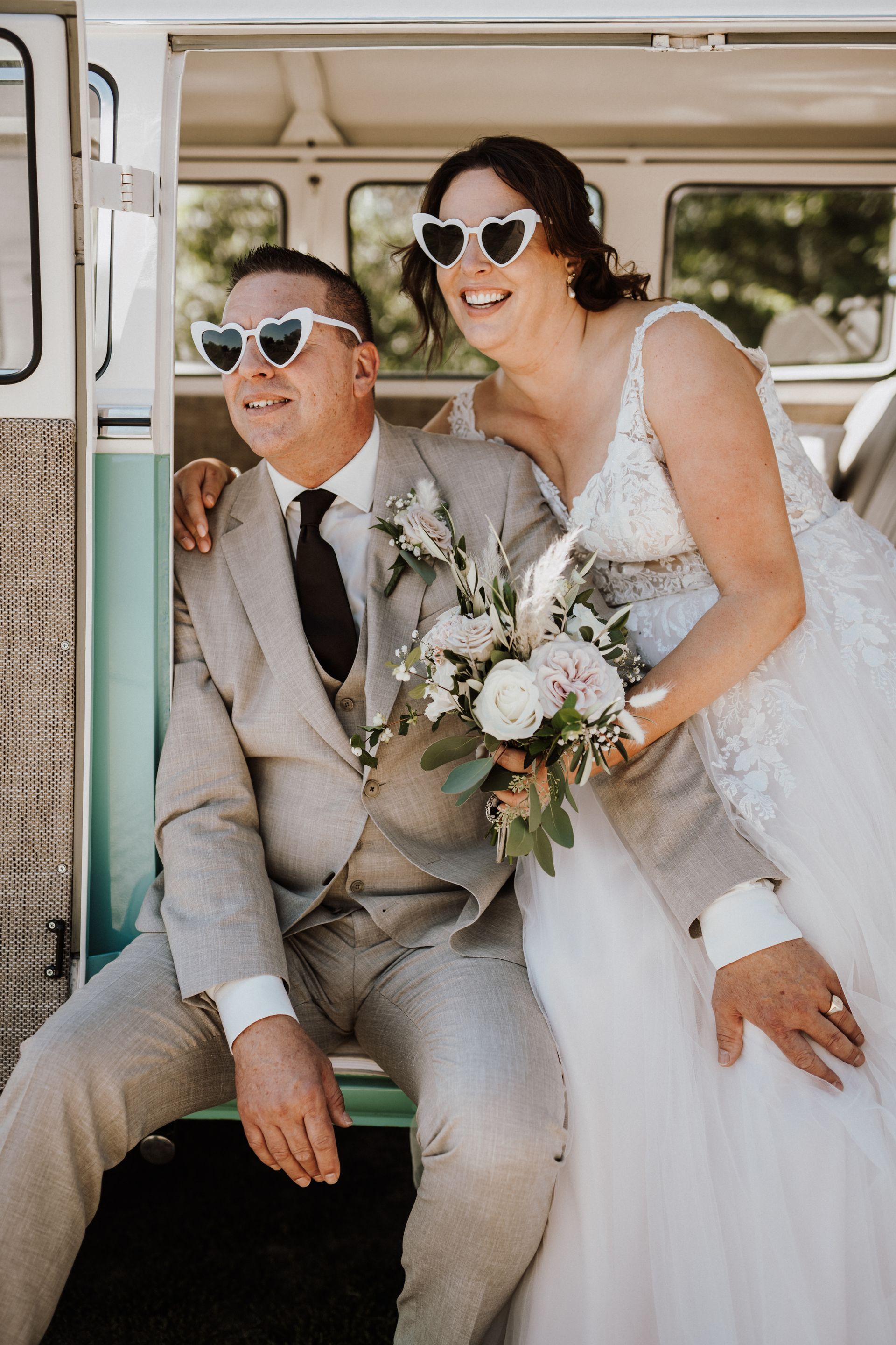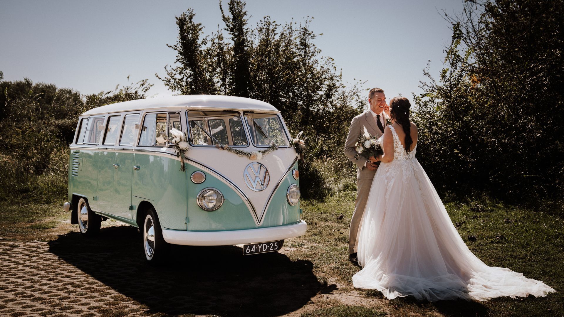 De bus brengt ons bij parkeerplaats Diederik in Limmen waar je zo de natuur instapt en tussen de wilde paarden of koeien kan komen te staan. Een prachtige bosrijke omgeving in een duinachtig gebied. De bus staat op het parkeerveld en de fotografen zijn volop bezig om prachtige fotos te maken. Michel en Vera lijken niets te merken van alle warmte en gaan volledig op in elkaar. Ineens haalt één van de fotografen een setje hartjes zonnebrillen te voor schijn en wat een geweldig moment was dat! Humor, lol en liefde... zo zijn Michel en Vera naar elkaar, met elkaar en met de mensen naast hun. Dat zie je terug op deze geweldige foto's!