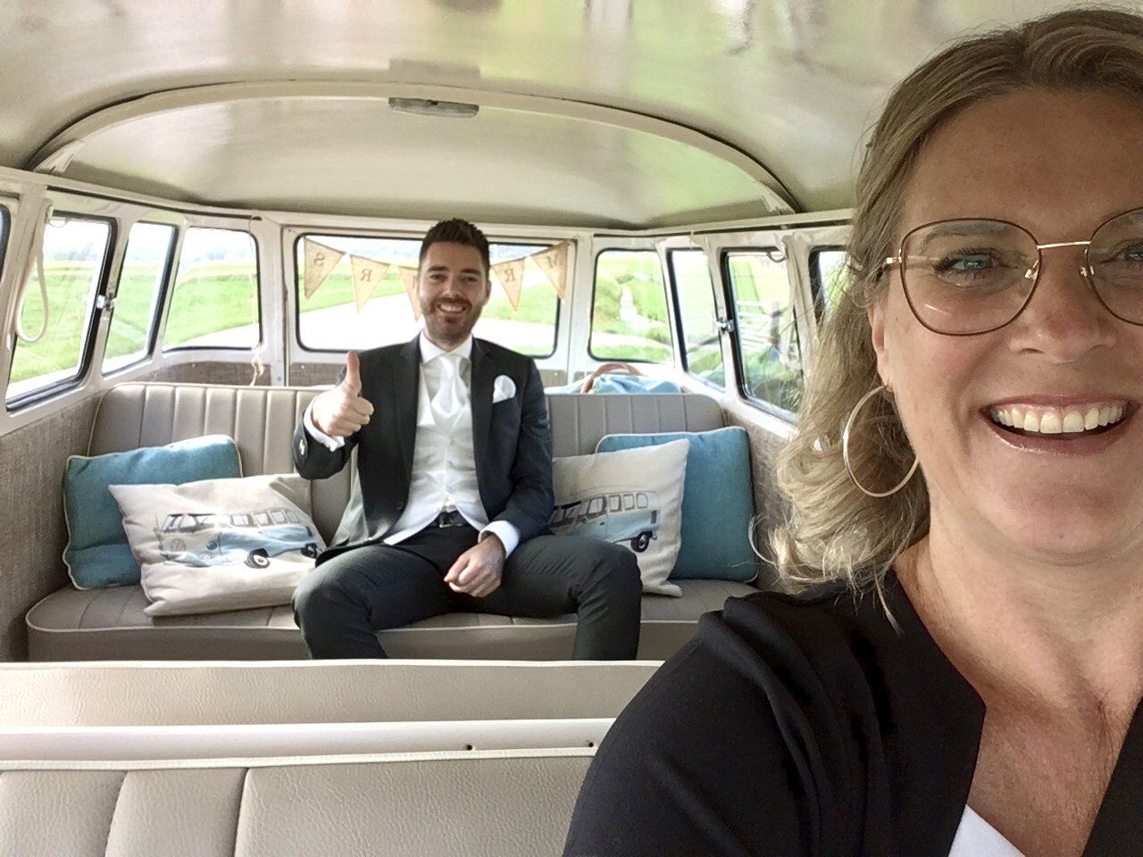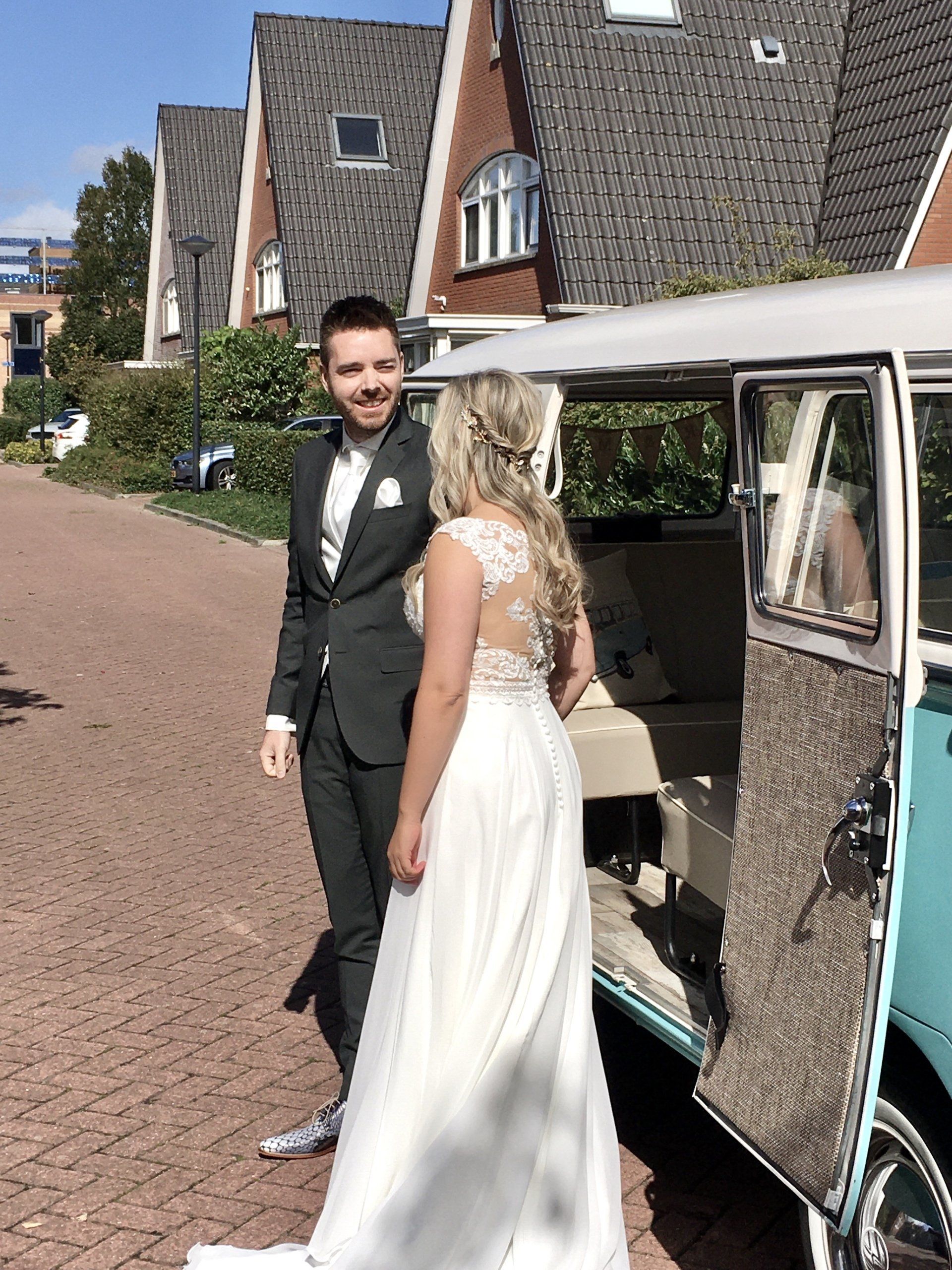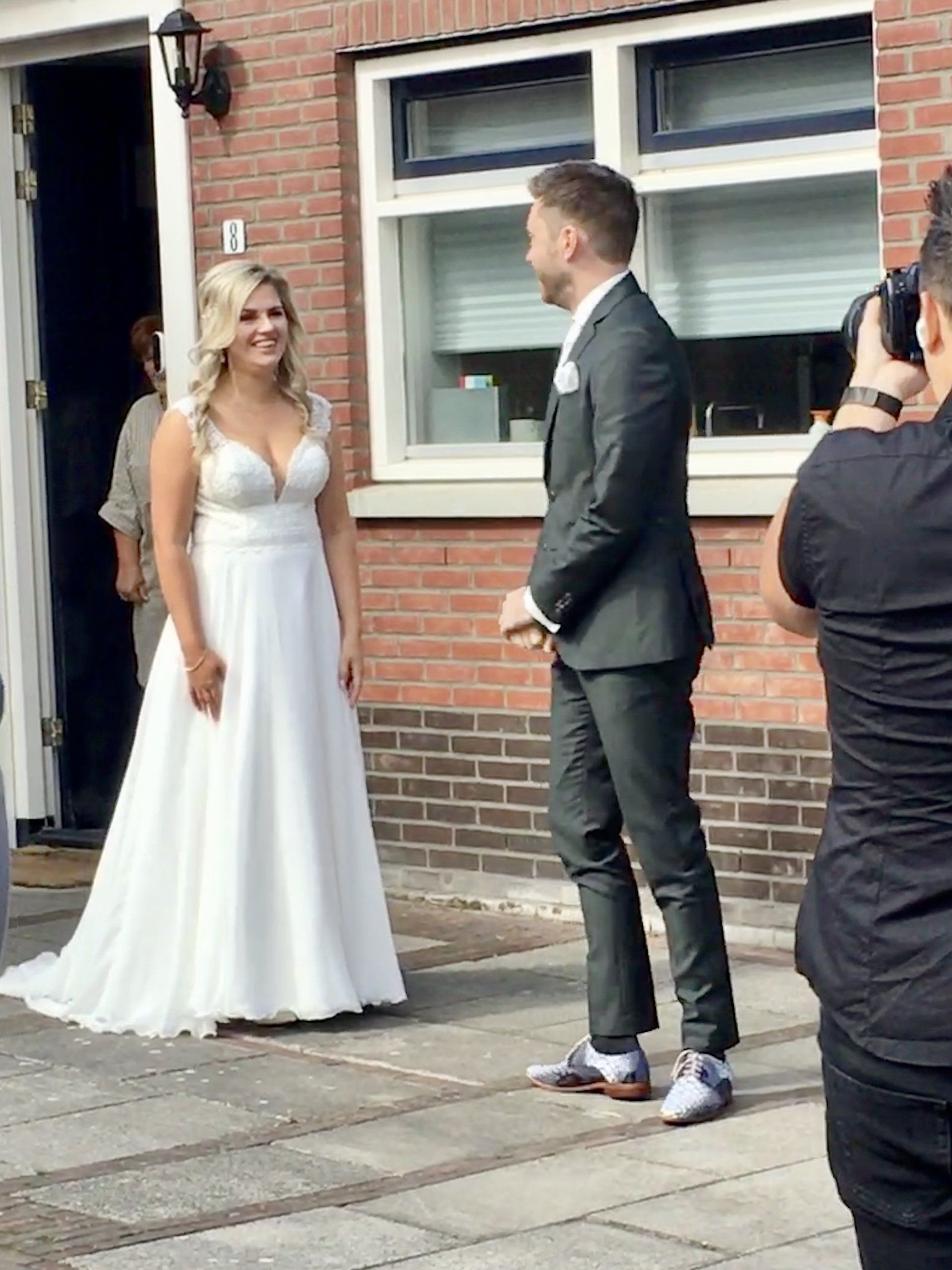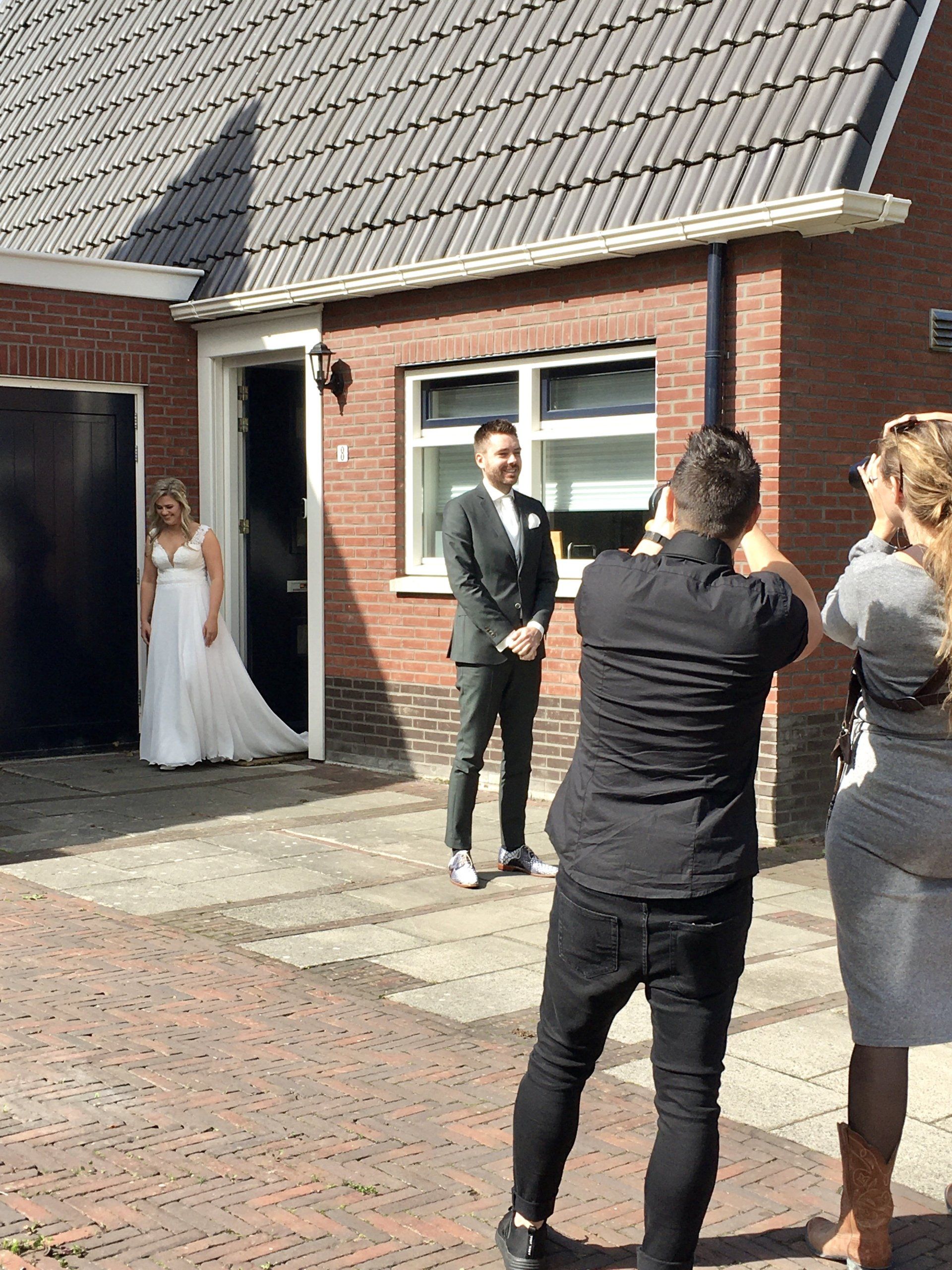 Bruidegom gevonden en met de foto-/videograaf in mijn kielzog op weg naar de bruid. Opnieuw door de weilanden heen met een kleine tussenstop voor een drone opname, hoe gaaf! De spanning voelde ik oplopen in de bus naar mate we dichterbij de bruid kwamen en hoe mooi is het om de reacties van beide te zien als ze elkaar voor de eerste keer zien.