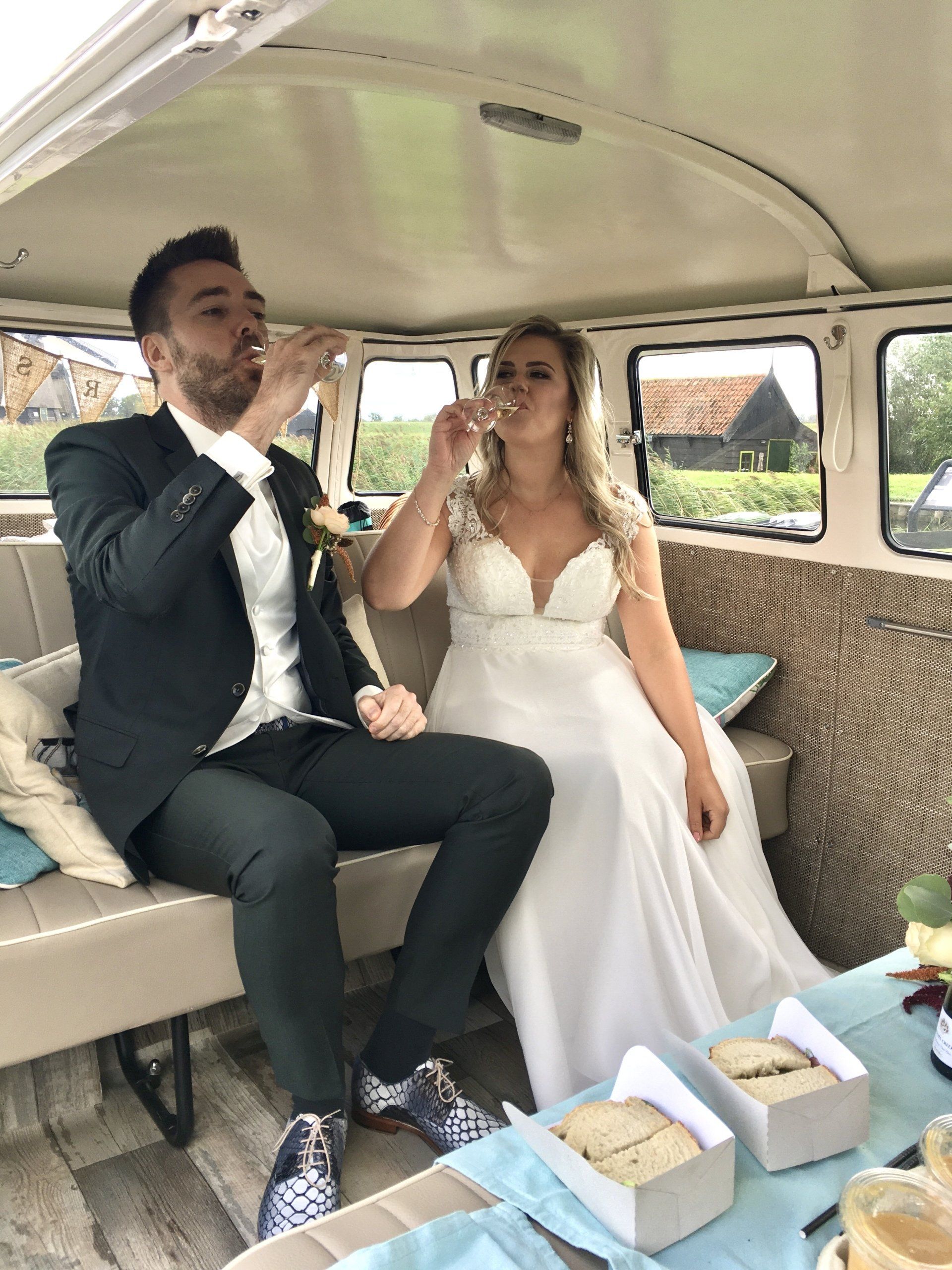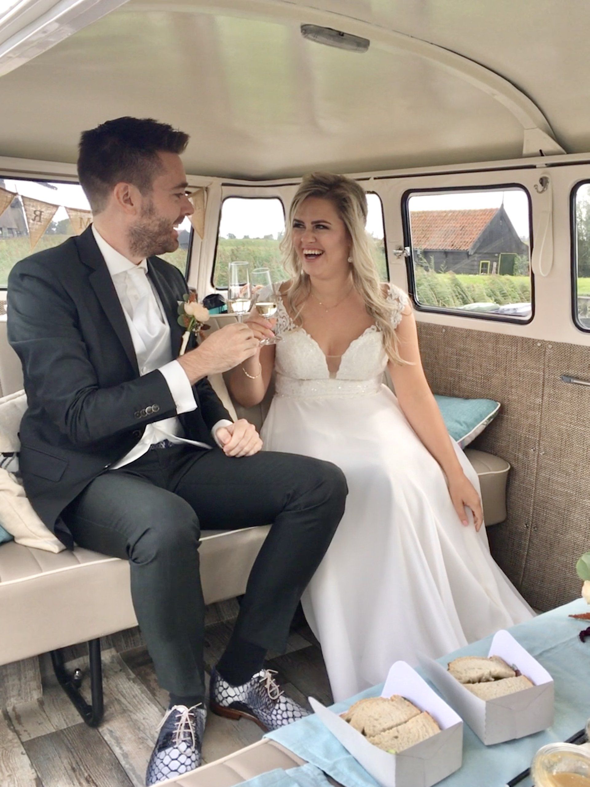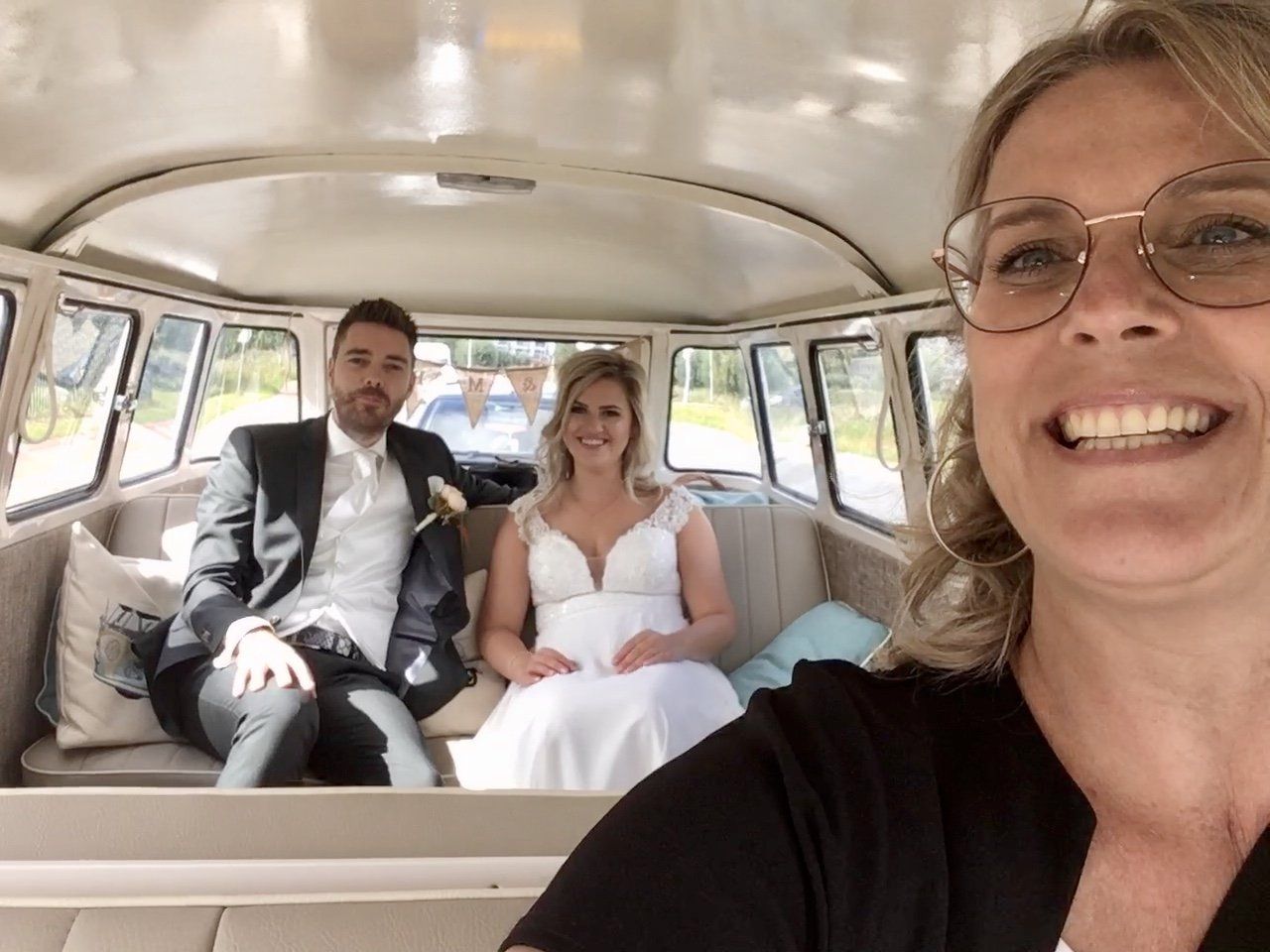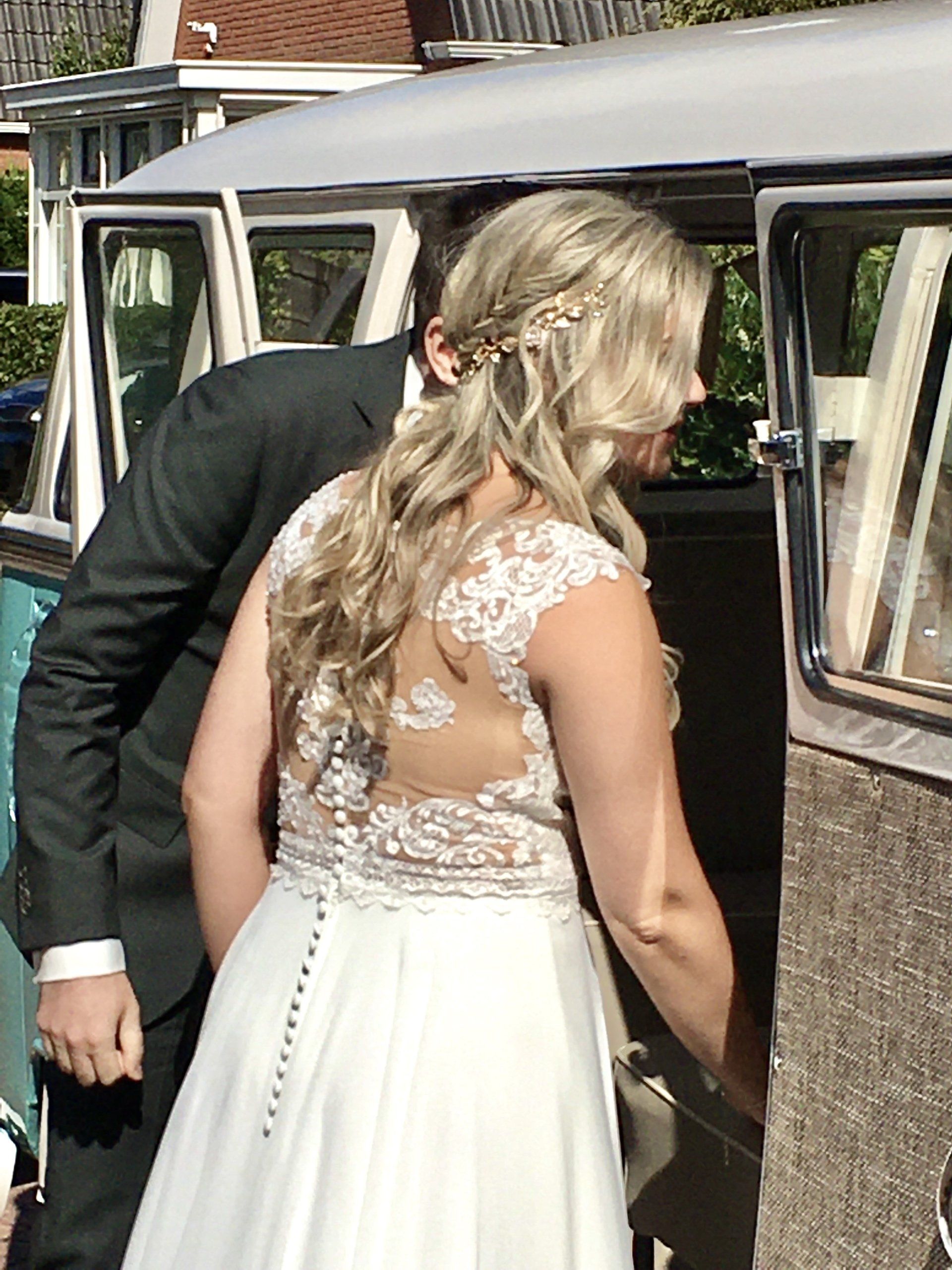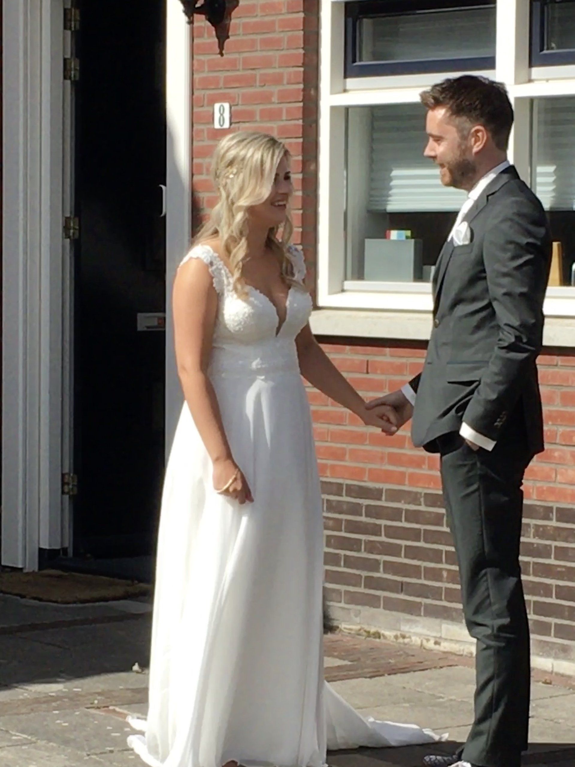 Bruidegom gevonden en met de foto-/videograaf in mijn kielzog op weg naar de bruid. Opnieuw door de weilanden heen met een kleine tussenstop voor een drone opname, hoe gaaf! De spanning voelde ik oplopen in de bus naar mate we dichterbij de bruid kwamen en hoe mooi is het om de reacties van beide te zien als ze elkaar voor de eerste keer zien.