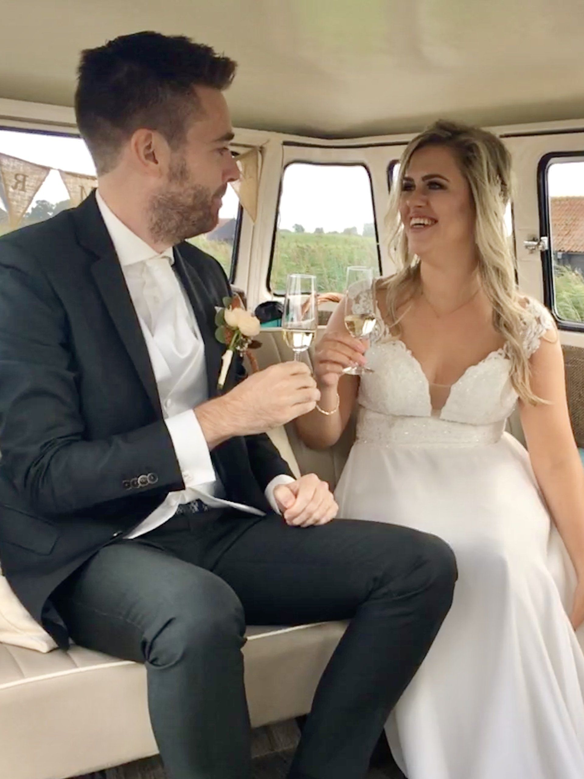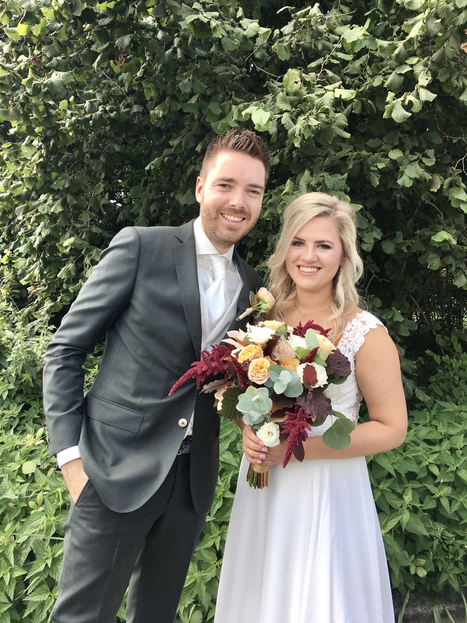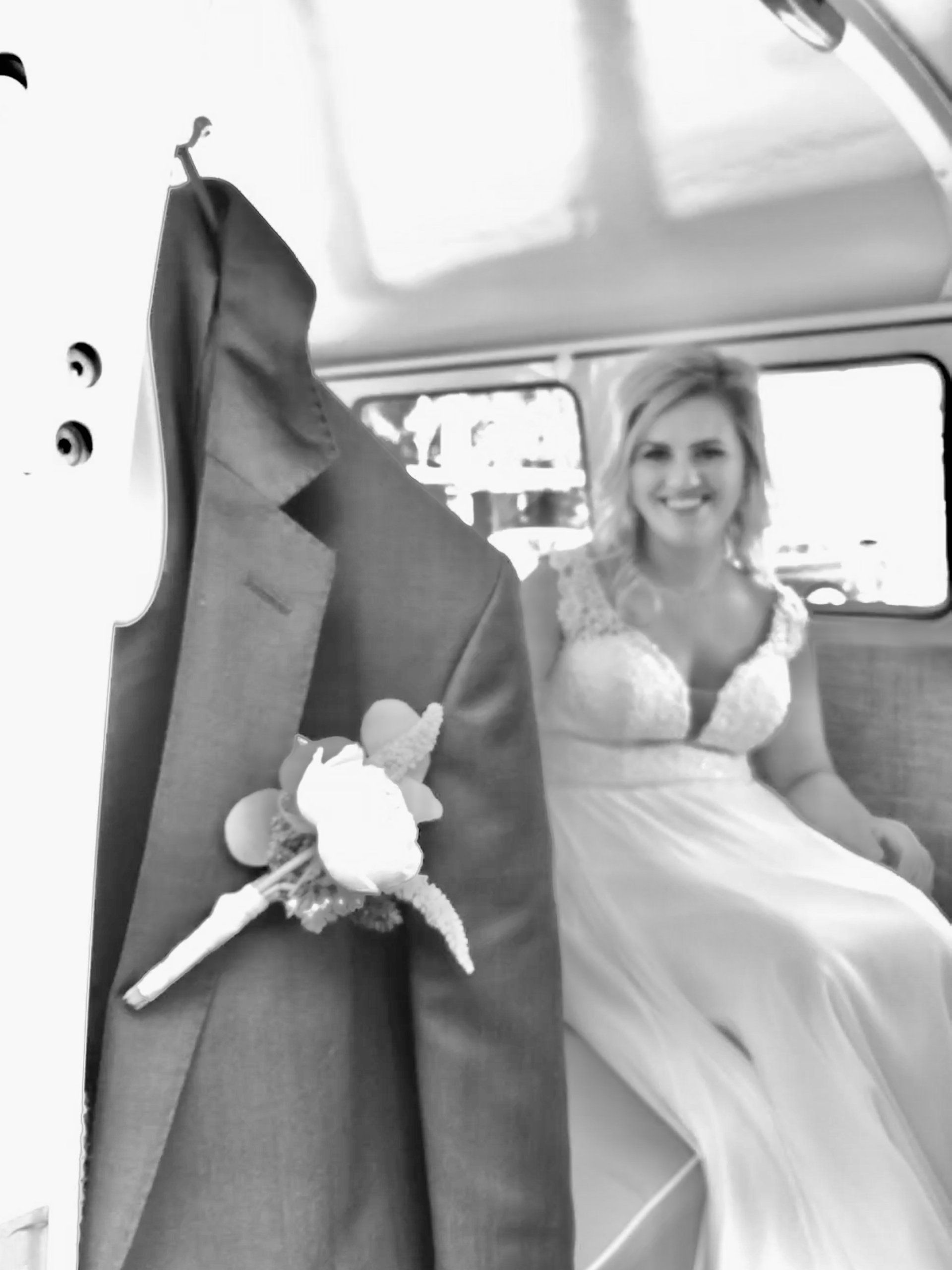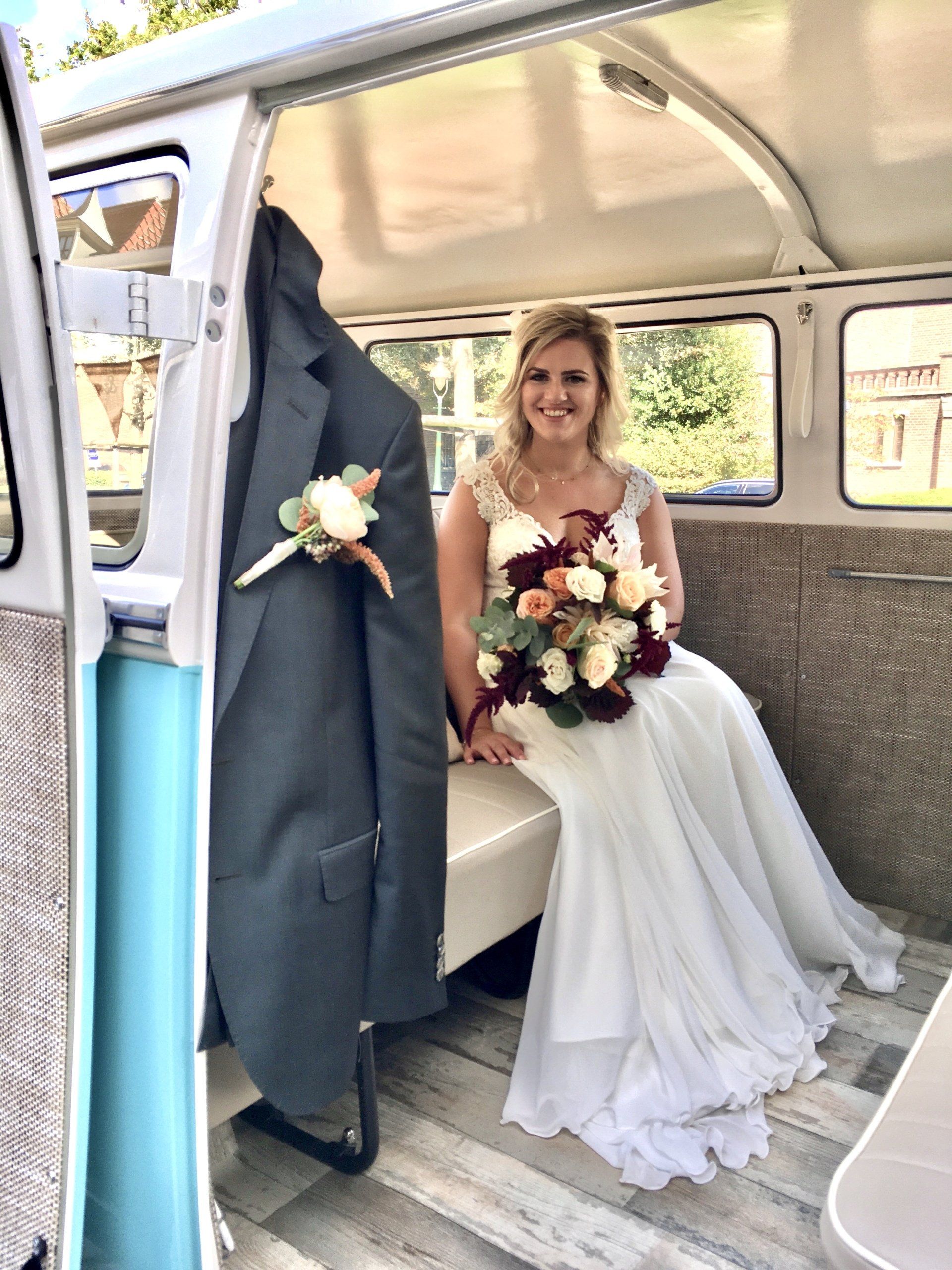 Bruidegom gevonden en met de foto-/videograaf in mijn kielzog op weg naar de bruid. Opnieuw door de weilanden heen met een kleine tussenstop voor een drone opname, hoe gaaf! De spanning voelde ik oplopen in de bus naar mate we dichterbij de bruid kwamen en hoe mooi is het om de reacties van beide te zien als ze elkaar voor de eerste keer zien.