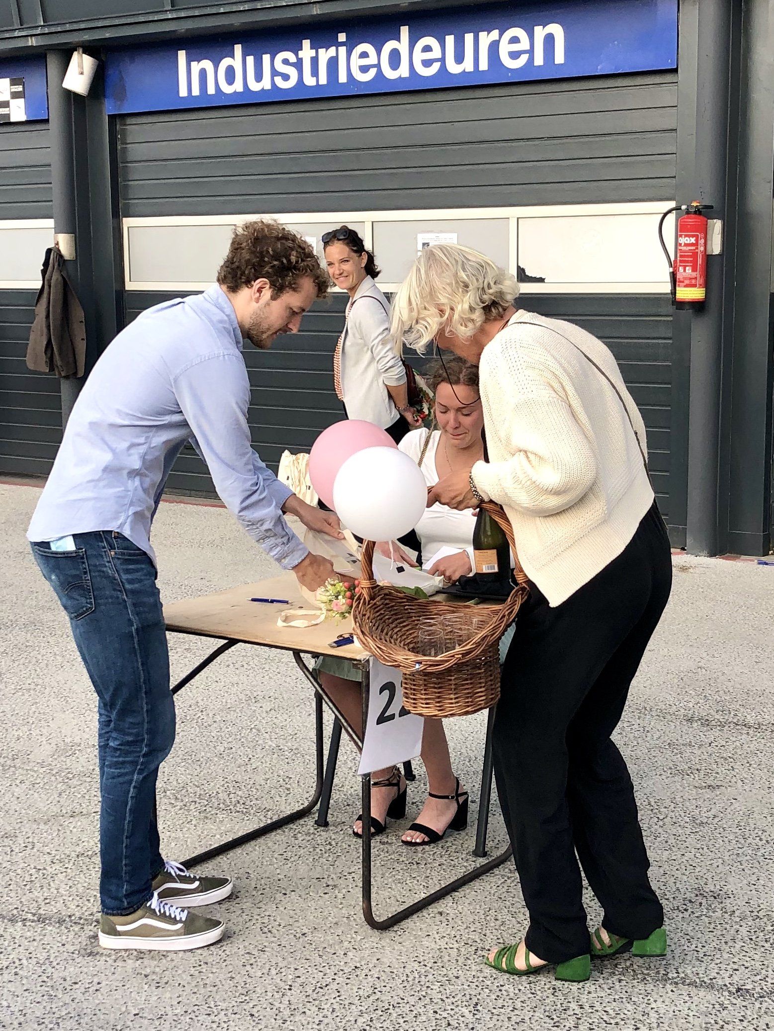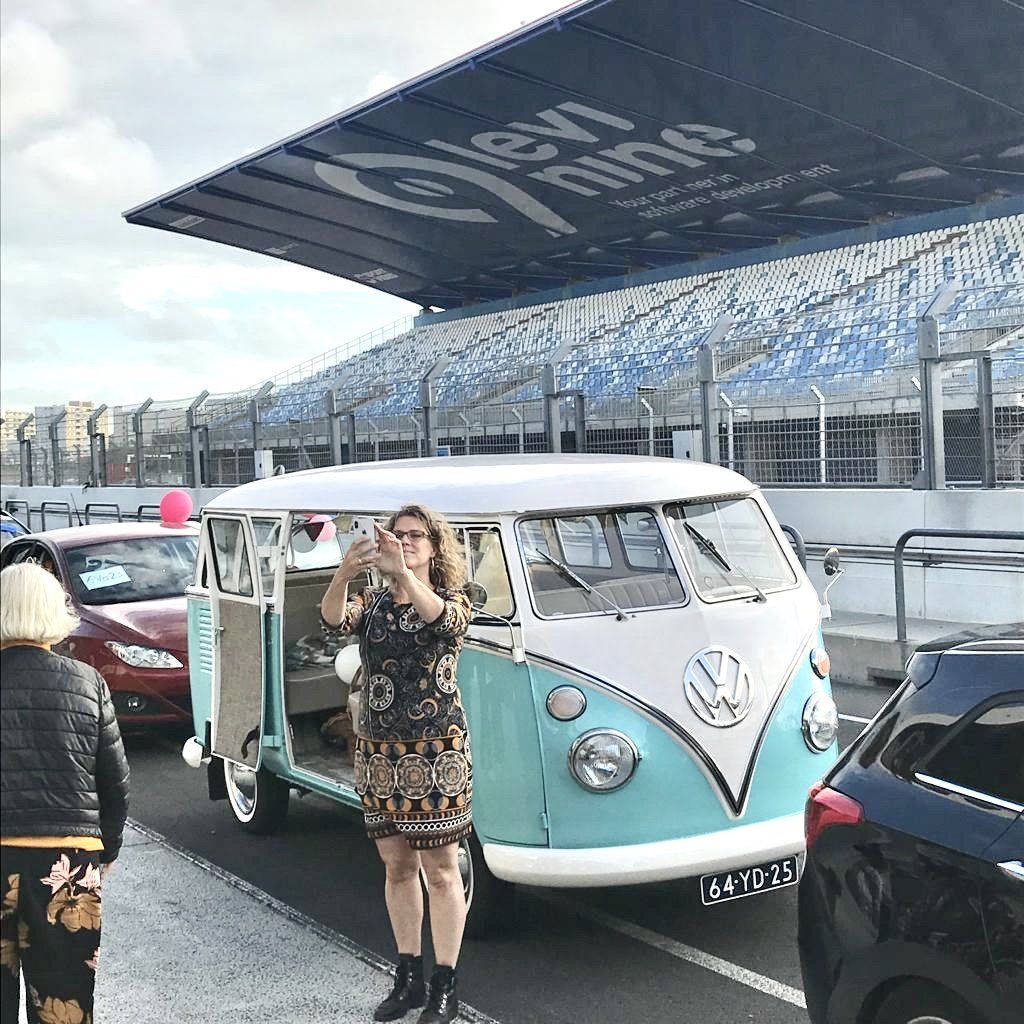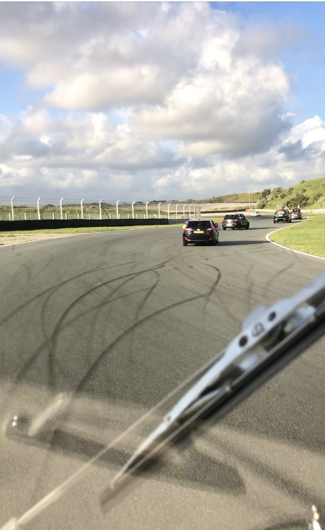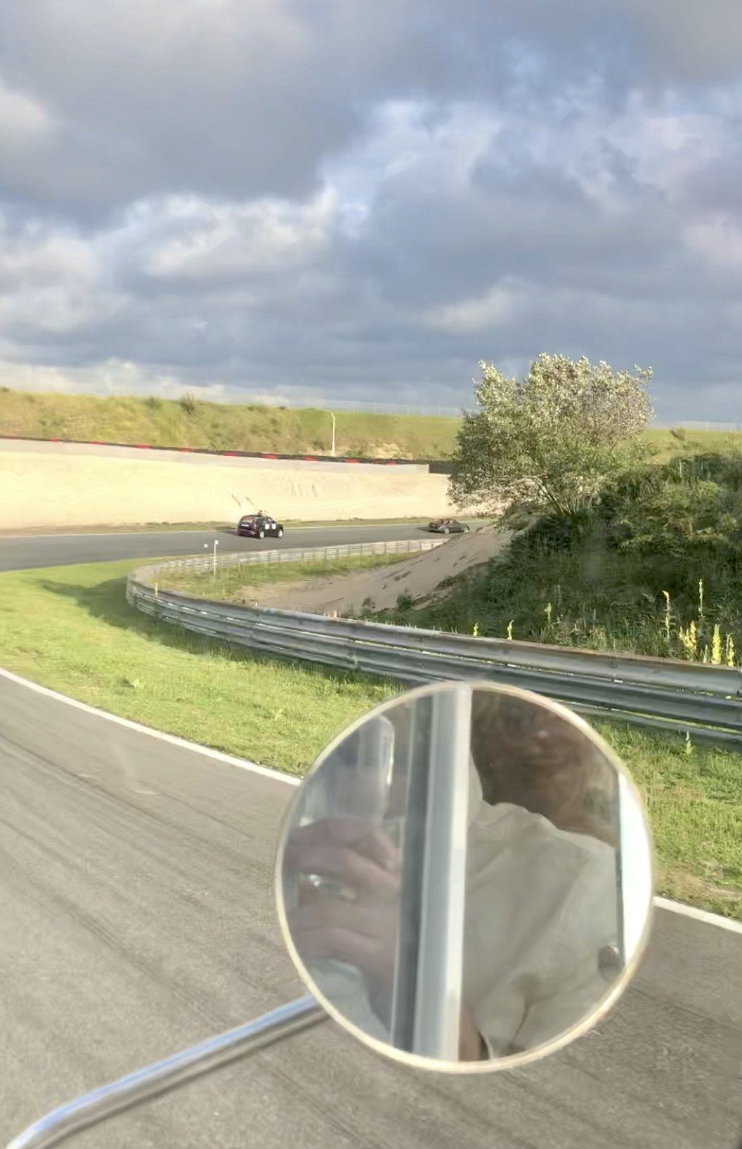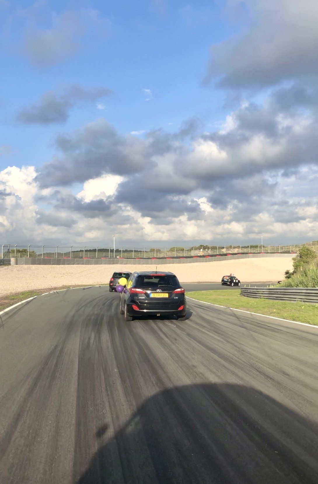Na even te hebben moeten wachten, mochten we het circuit op naar de pitstraat. Daar stonden tafeltjes en stoelen voor de examenkandidaten om hun diploma's te ondertekenen. Even proosten met de bubbels en toen hup de bus in het gas er op! Nou ja, gas... mijn busje gaat niet zo snel en hard hahaah! Zo gaaf om op het nieuwe circuit te mogen rijden en bij de eerste echte bocht bleek zelfs 40 km best hard te zijn hihihi!