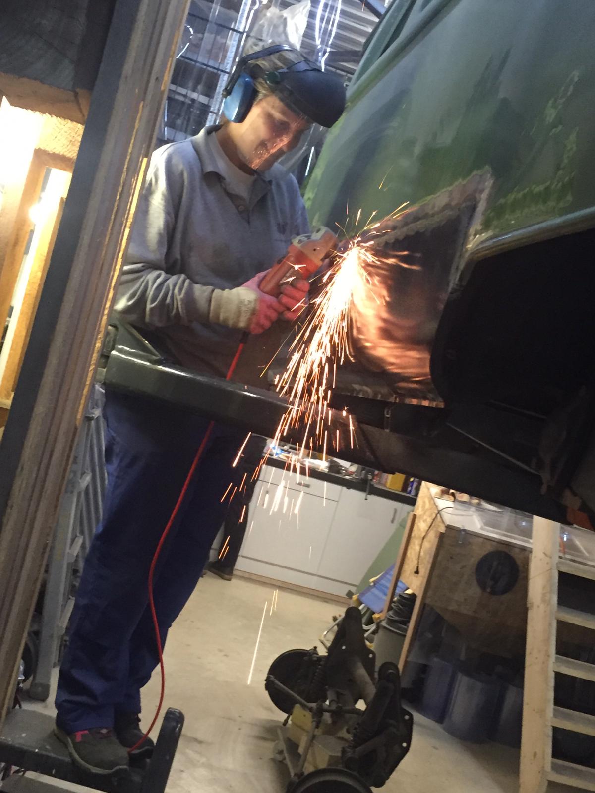 Voor het zover is moet de bus natuurlijk wel helemaal spik en span in orde zijn. En die groene kleur is niet echt mijn kleurtje. Dus... aan de klus! De bus strippen, slijpen, lassen, schuren.... wij draaien onze handen er niet voor om. Stap voor stap ontdoen we onze bus van al haar ongemakken. Stijlen worden uitgeslepen, balken worden verwijderd en dikke lagen plamuur weg geslepen. Iedere keer als we denken: "We zijn er bijna..." ontdekken we weer een minder puntje die we niet laten zitten.