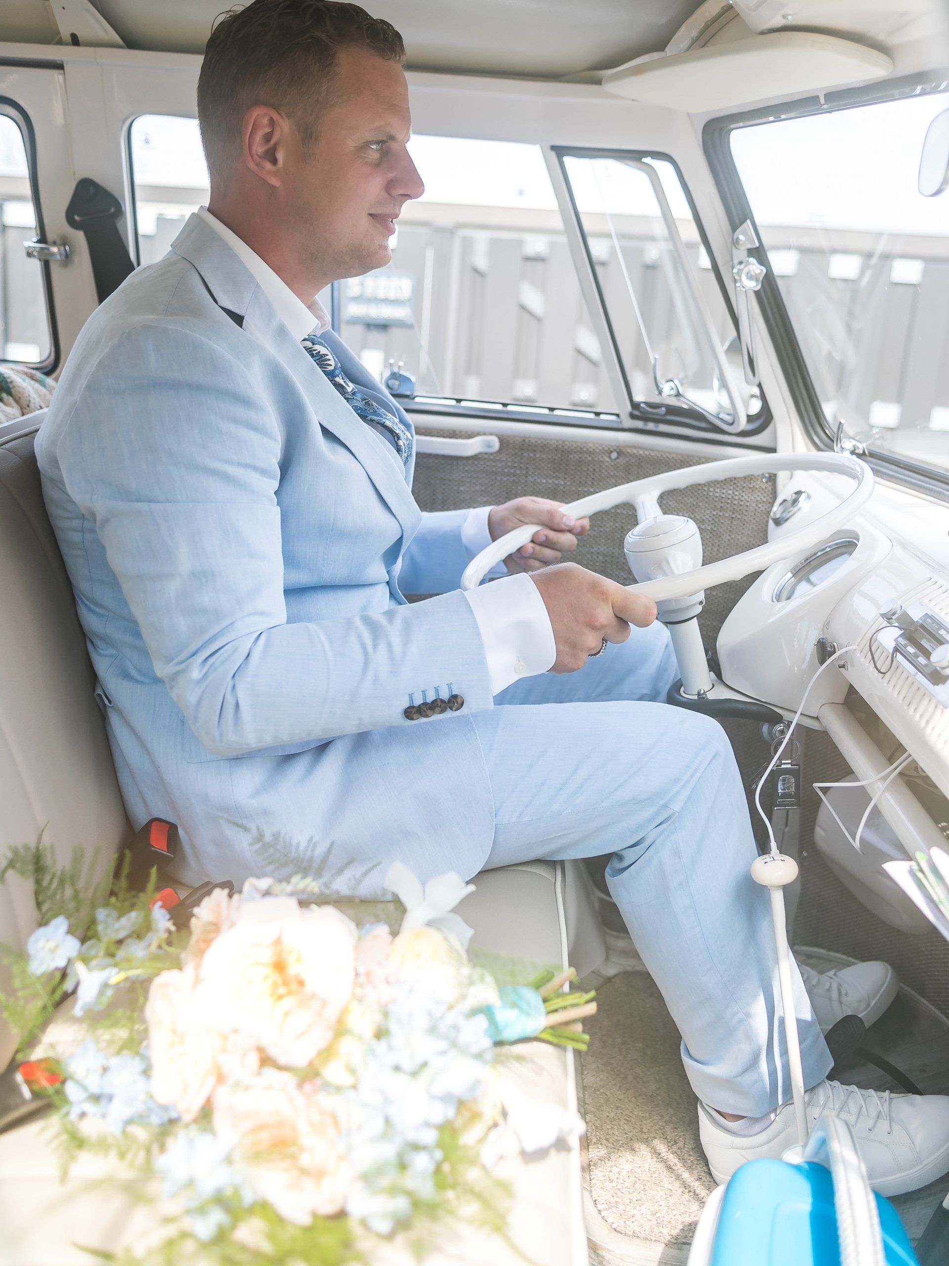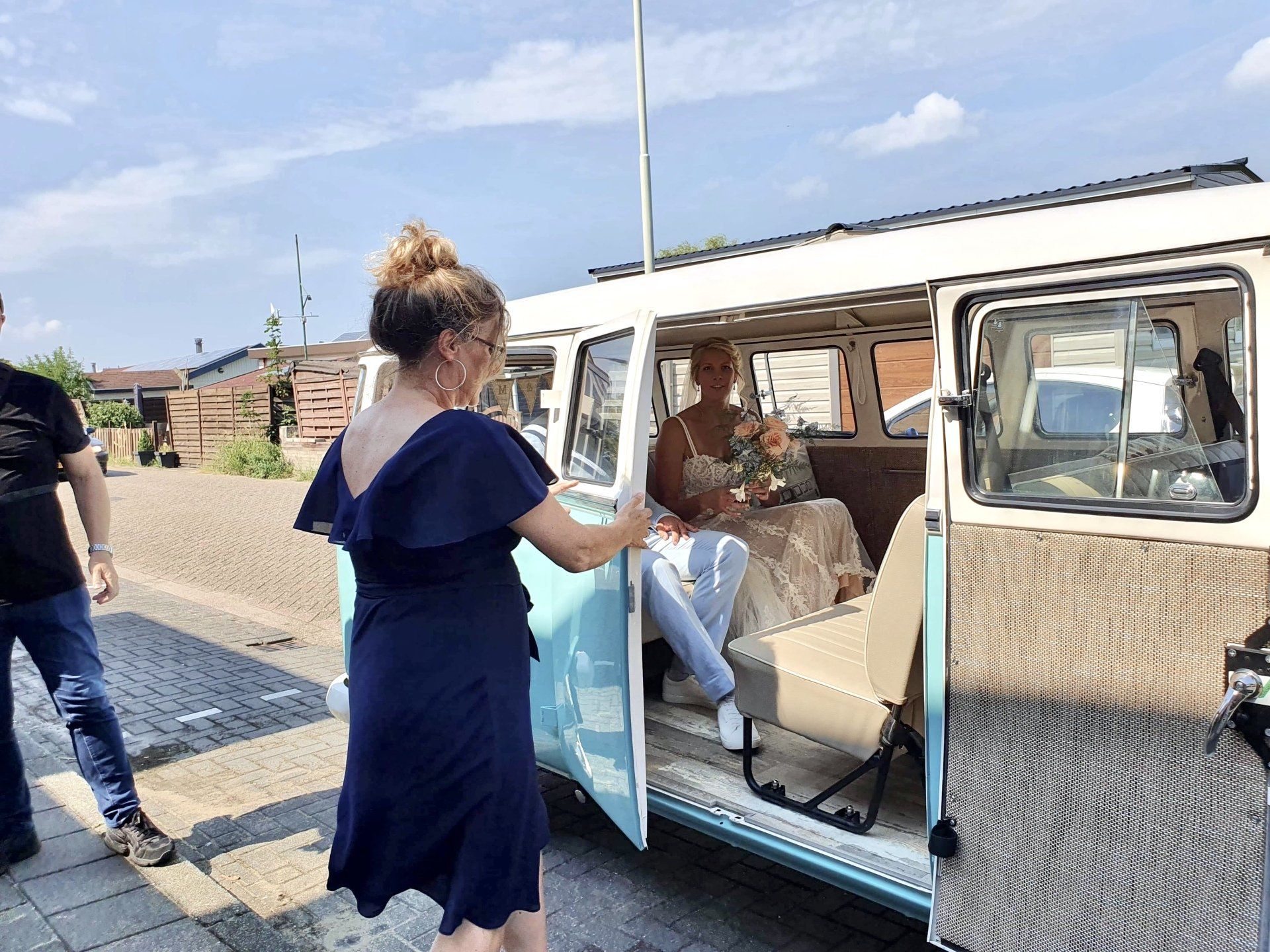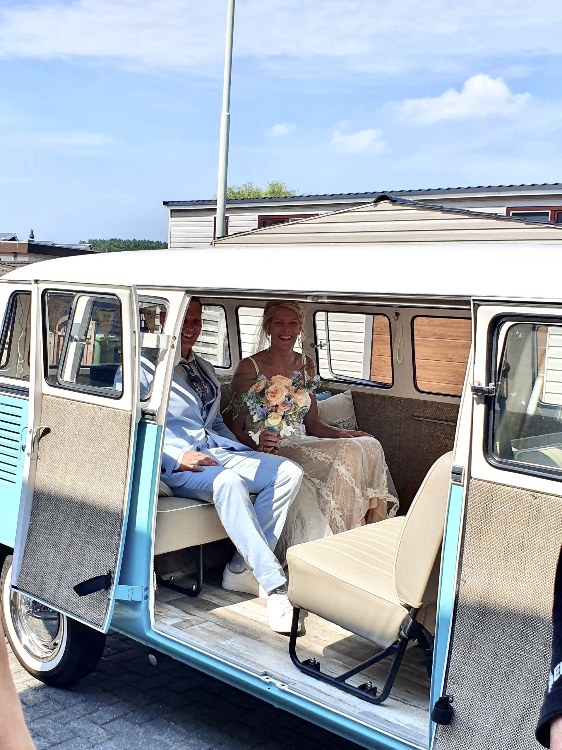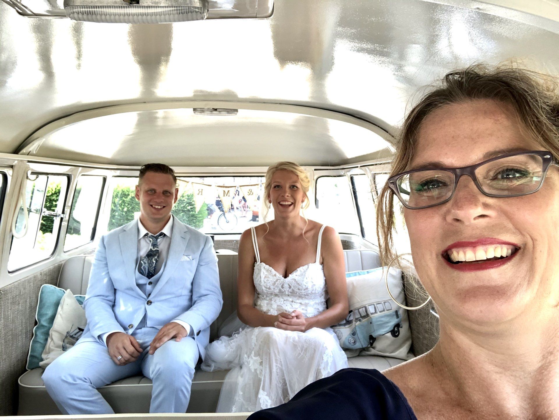 16 augustus 2020: met 34 graden op de temperatuurmeter, best een warme dag. Onderweg de raampjes van de bus open en heerlijk genietend onderweg richting Zaanstad. Bij de bruidegom aangekomen staan alle mannen buiten in de schaduw te genieten en te wachten tot het startsein. De bruid bevindt zich op 100 meter afstand en hoewel ik geen andere mensen laat rijden in mijn bus, is 100 meter natuurlijk niks en mocht de bruidegom even achter het stuur kruipen.