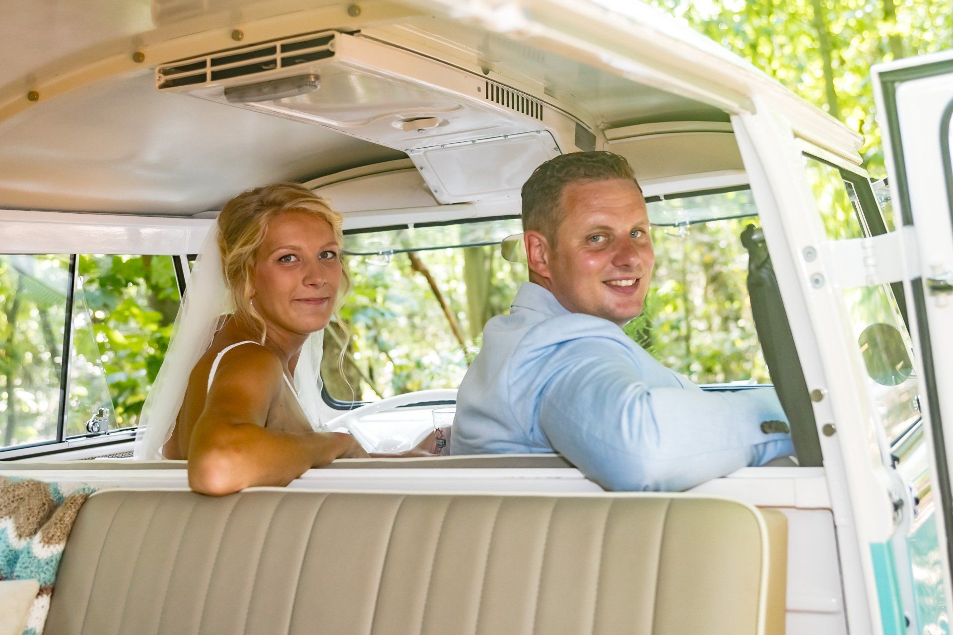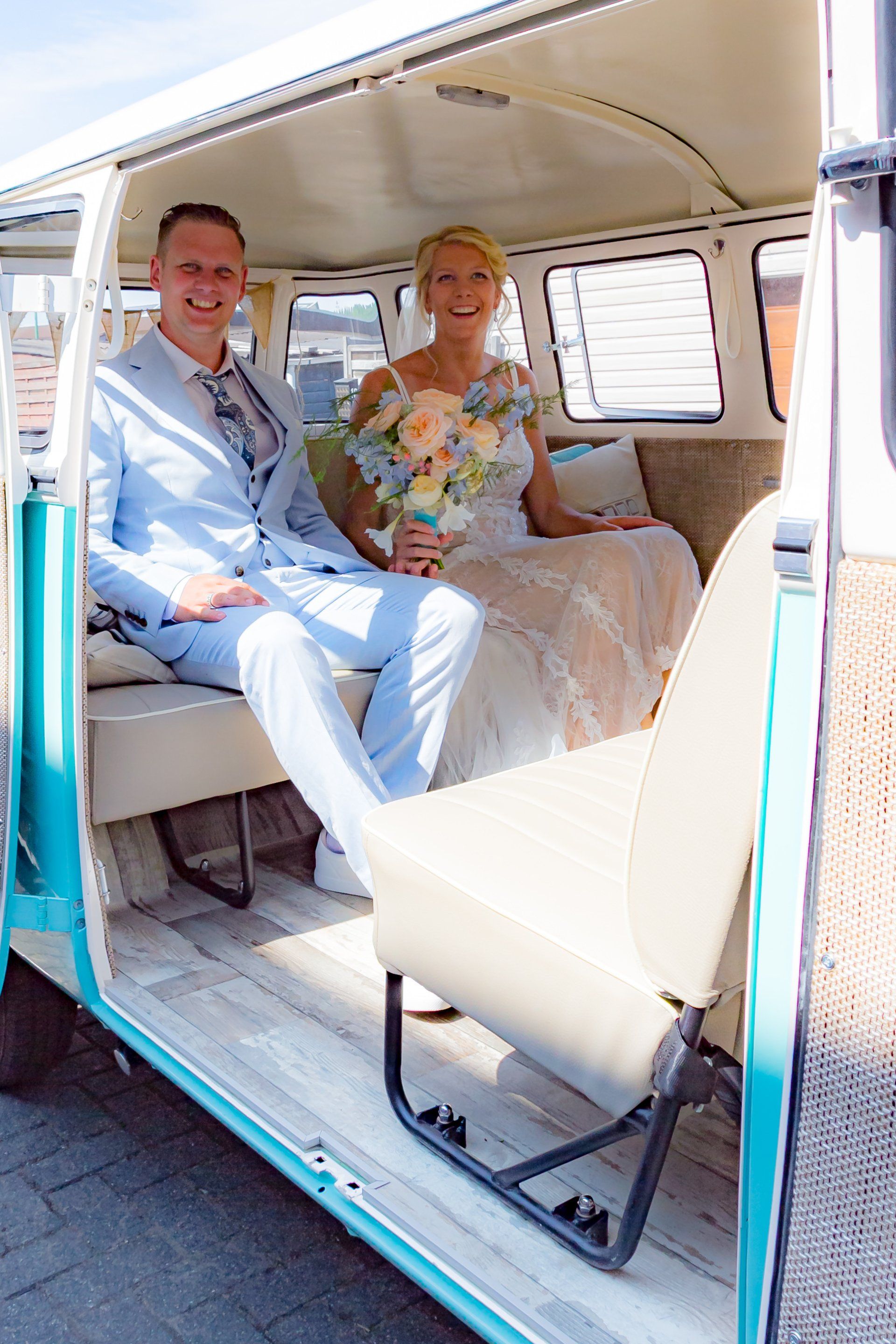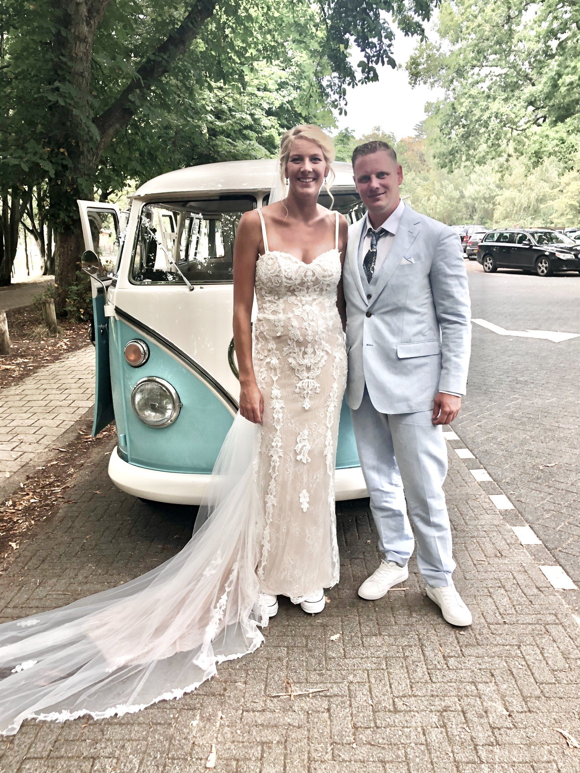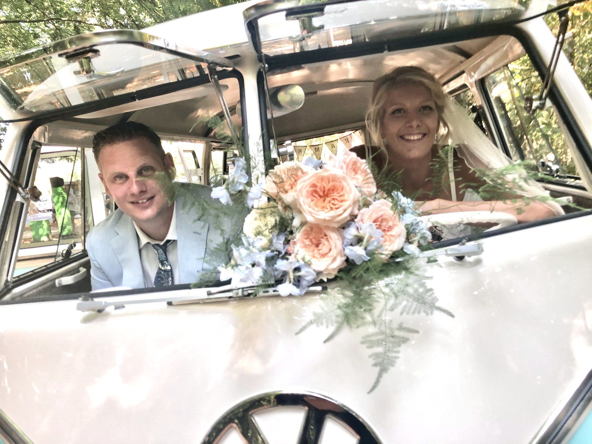 16 augustus 2020: met 34 graden op de temperatuurmeter, best een warme dag. Onderweg de raampjes van de bus open en heerlijk genietend onderweg richting Zaanstad. Bij de bruidegom aangekomen staan alle mannen buiten in de schaduw te genieten en te wachten tot het startsein. De bruid bevindt zich op 100 meter afstand en hoewel ik geen andere mensen laat rijden in mijn bus, is 100 meter natuurlijk niks en mocht de bruidegom even achter het stuur kruipen.