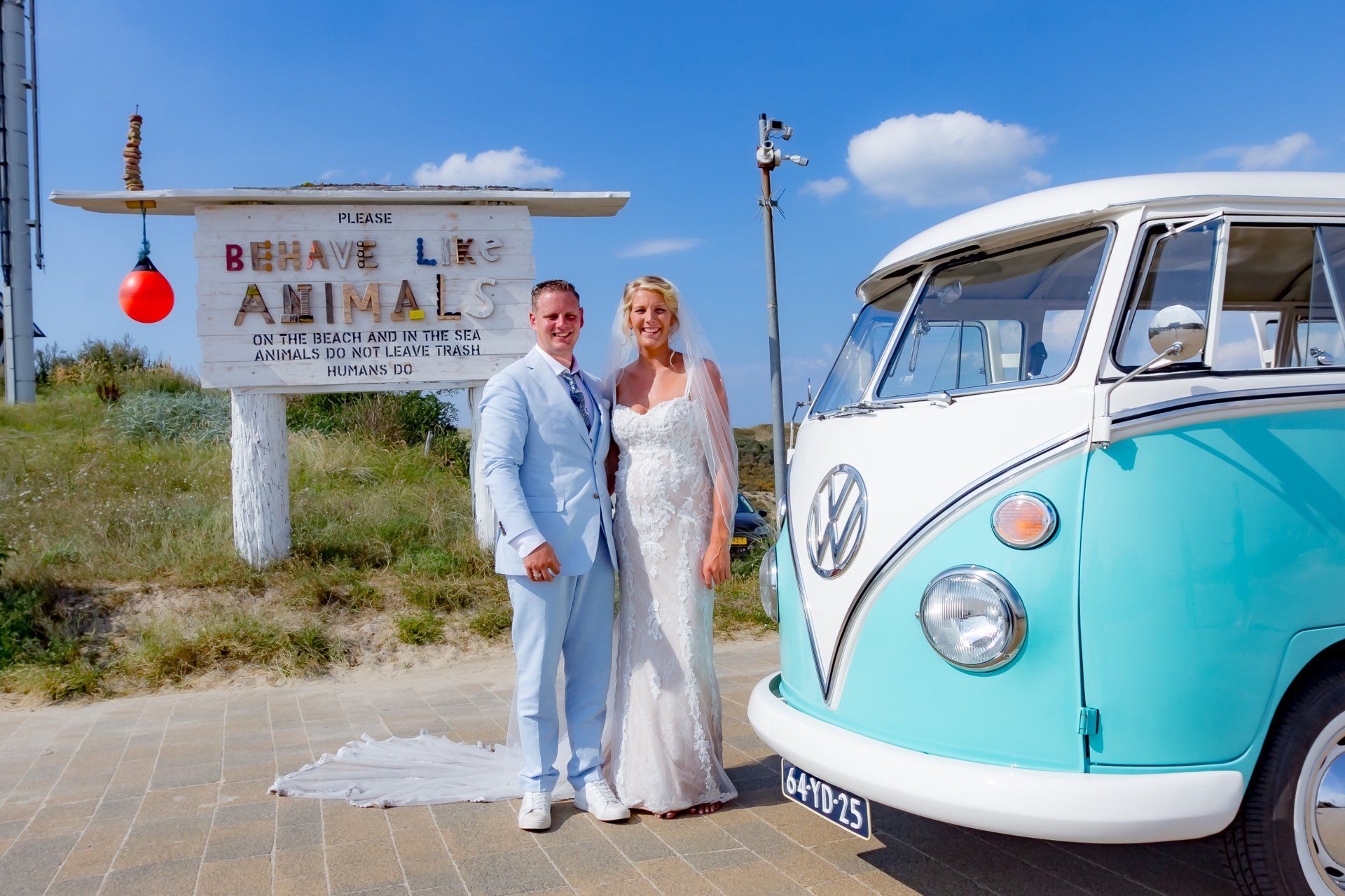 The first look vond plaats in de achtertuin en vervolgens stapt het bruidspaar in de bus om on route onze weg te vervolgen naar het bos. Heerlijk in de schaduw met af en toe een klein briesje. De ceremonie vond plaats op het strand van Castricum. Zon, zomer, zand en zee... genieten!